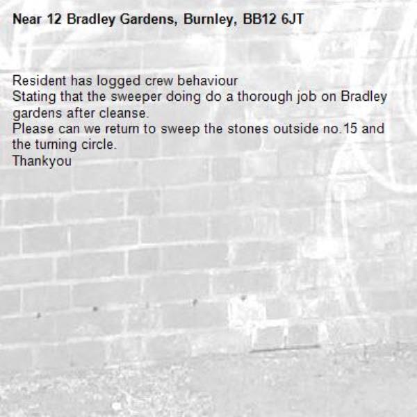 Resident has logged crew behaviour Stating that the sweeper doing do a thorough job on Bradley gardens after cleanse. Please can we return to sweep the stones outside no.15 and the turning circle. Thankyou