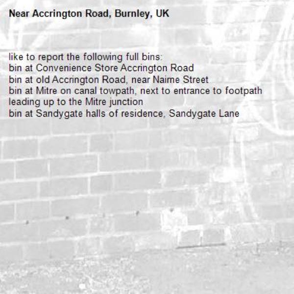 like to report the following full bins: bin at Convenience Store Accrington Road bin at old Accrington Road, near Nairne Street bin at Mitre on canal towpath, next to entrance to footpath leading up to the Mitre junction bin at Sandygate halls of residence, Sandygate Lane