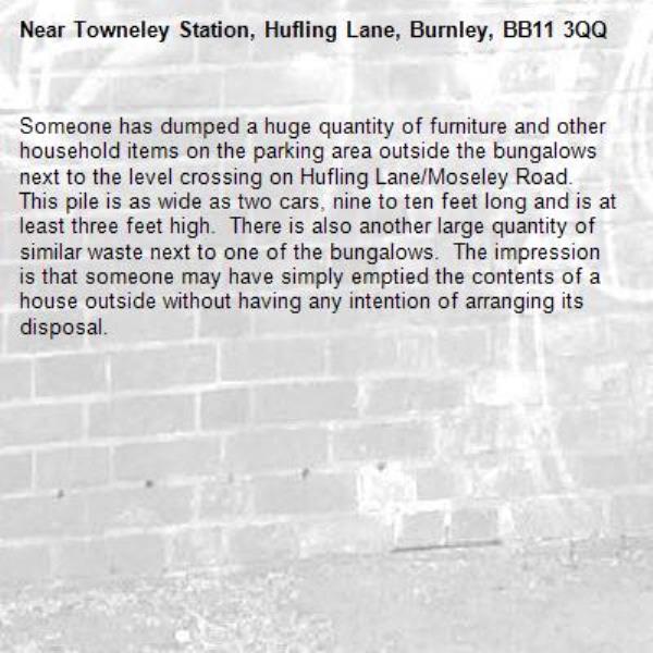 Someone has dumped a huge quantity of furniture and other household items on the parking area outside the bungalows next to the level crossing on Hufling Lane/Moseley Road. This pile is as wide as two cars, nine to ten feet long and is at least three feet high. There is also another large quantity of similar waste next to one of the bungalows. The impression is that someone may have simply emptied the contents of a house outside without having any intention of arranging its disposal.