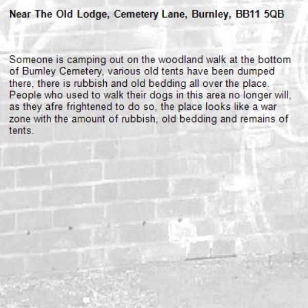 Someone is camping out on the woodland walk at the bottom of Burnley Cemetery, various old tents have been dumped there, there is rubbish and old bedding all over the place. People who used to walk their dogs in this area no longer will, as they afre frightened to do so, the place looks like a war zone with the amount of rubbish, old bedding and remains of tents.