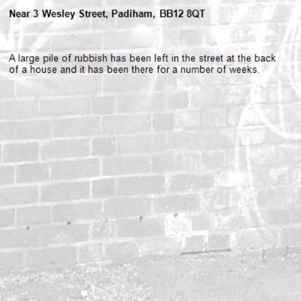 A large pile of rubbish has been left in the street at the back of a house and it has been there for a number of weeks.