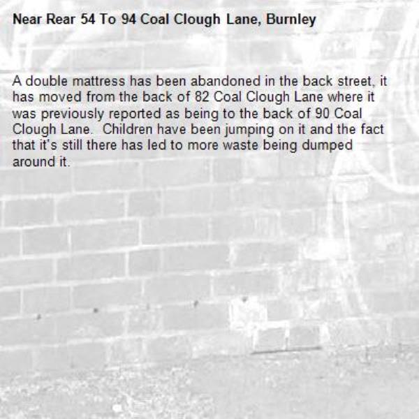 A double mattress has been abandoned in the back street, it has moved from the back of 82 Coal Clough Lane where it was previously reported as being to the back of 90 Coal Clough Lane. Children have been jumping on it and the fact that it's still there has led to more waste being dumped around it.